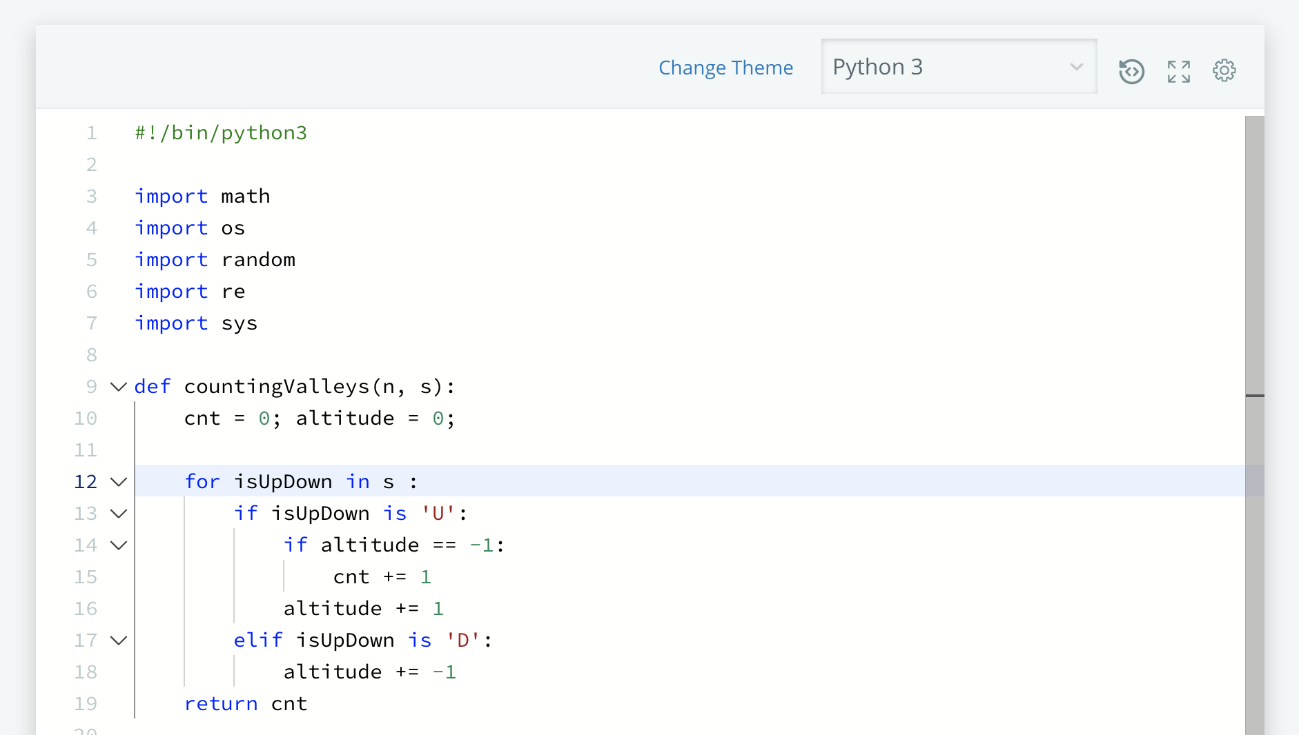 def countingValleys(n, s): cnt = 0; altitude = 0; for isUpDown in s : if isUpDown is 'U': if altitude == -1: cnt += 1 altitude += 1 elif isUpDown is 'D': altitude += -1 return cnt- 위의 문제에서 해석했듯이, 'Valley를 얼마나 갔다왔는가?'를 카운팅해주기 위해서는 해수면 아래, 즉 마이너스로 몇번이나 내려갔다가 0으로 돌아왔는지를 세어주면 된다.