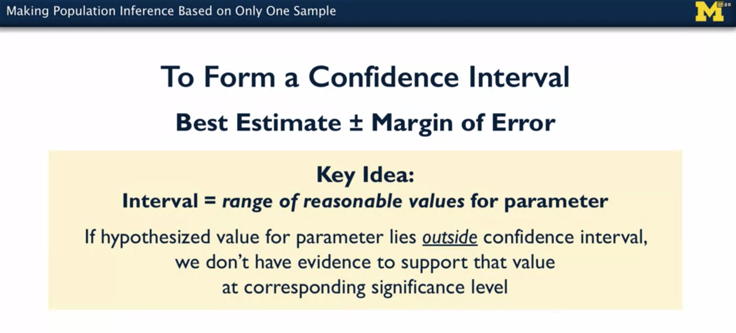 - 확률 표본하에서는 신뢰구간 (Confidence Interval) 개념이 등장한다.
