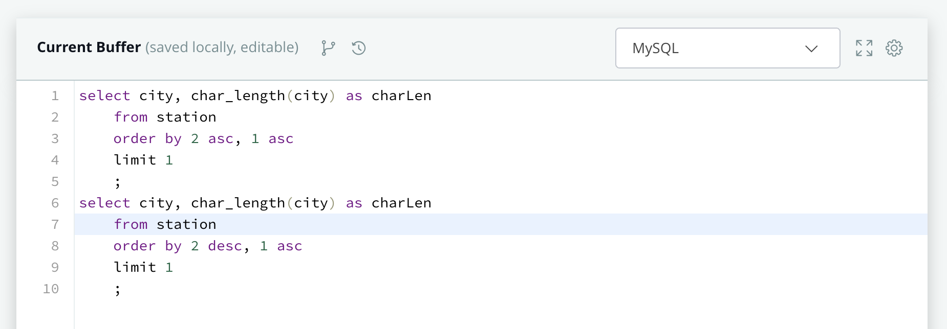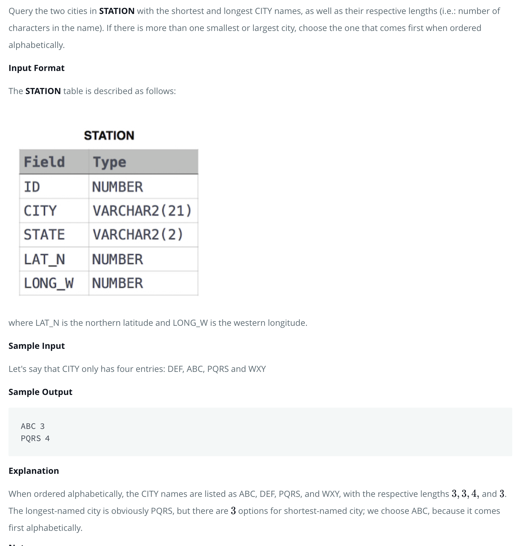 - 그외 문제 조건으로, 길이가 같은 경우 Alphabetically first 인 것을 출력하라는 조건이 있었기 때문에, 길이 조건 이후에 알파벳 순서로 따로 order by ascending 컨디션으로 다시 정렬을 해주어야 했습니다.