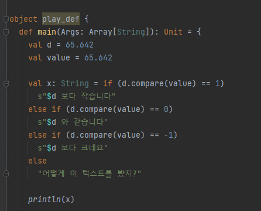 클래스정의는 object 키워드를 통해 사용. 함수정의는 def [함수명]([파라미터명]: [파라미터타입]): [반환타입] = {} 형식으로 사용한다. 자바를 전승하는 언어이기 때문에 자바처럼 기본 자료형타입 내에 작성되어있는 compare와 같은 메소드들도 사용 가능하다. If문 같은 경우도 Syntax는 위와 같은데 다른 언어와의 차이점이라면 해당 분기의 실행 값의 맨 마지막 라인에 수행된 값이 res형태로 반환된다는 것이다.