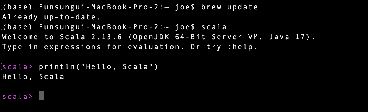 잠시 기다려주면 설치가 완료되는데 터미널에 scala를 입력해주면 배쉬창을 통해 간단한 명령어를 입력할 수 있는 프롬프트가 실행된다