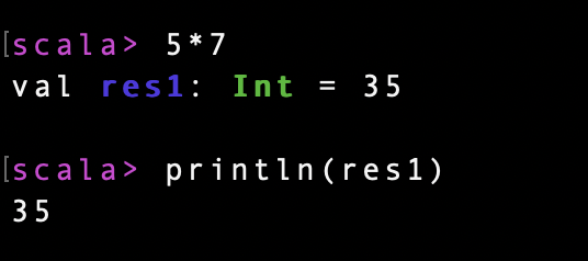 스칼라 언어의 재미있는 점 중 하나는 따로 명시적으로 연산 결과를 명시적인 변수에 저장을 하지 않더라도 REPL 상에서 실행된 명령어는 res[n]의 명칭으로 value 타입으로 저장이 된다는 것이다. 5*7를 연산하고 따로 저장하지 않더라도 아래의 셸 라인에서 res1에 접근함으로써 이전 연산 결과를 가져와서 재사용할 수 있게한다.