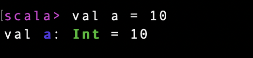 위에서 봤던 것 처럼 스칼라의 변수는 variable이거나 value이다. 그 차이점은 가변성이 있는지 없는지 이고, 가변성이 없는 value의 경우 데이터 연산 처리중 변하면 안되는 constant 벨류를 저장하는 데에 주로 사용된다. 아래 형식처럼 val a = 10을 넣어주어도 스칼라는 타입힌팅을 알아서 처리하기 때문에 Int형식으로 자동저장되는 것도 볼 수 있다.