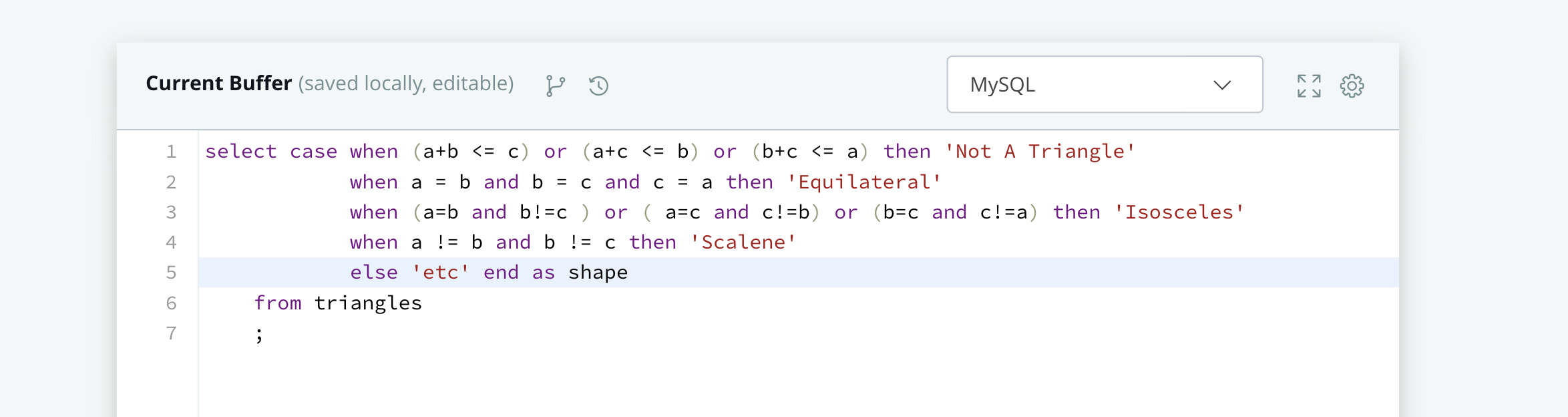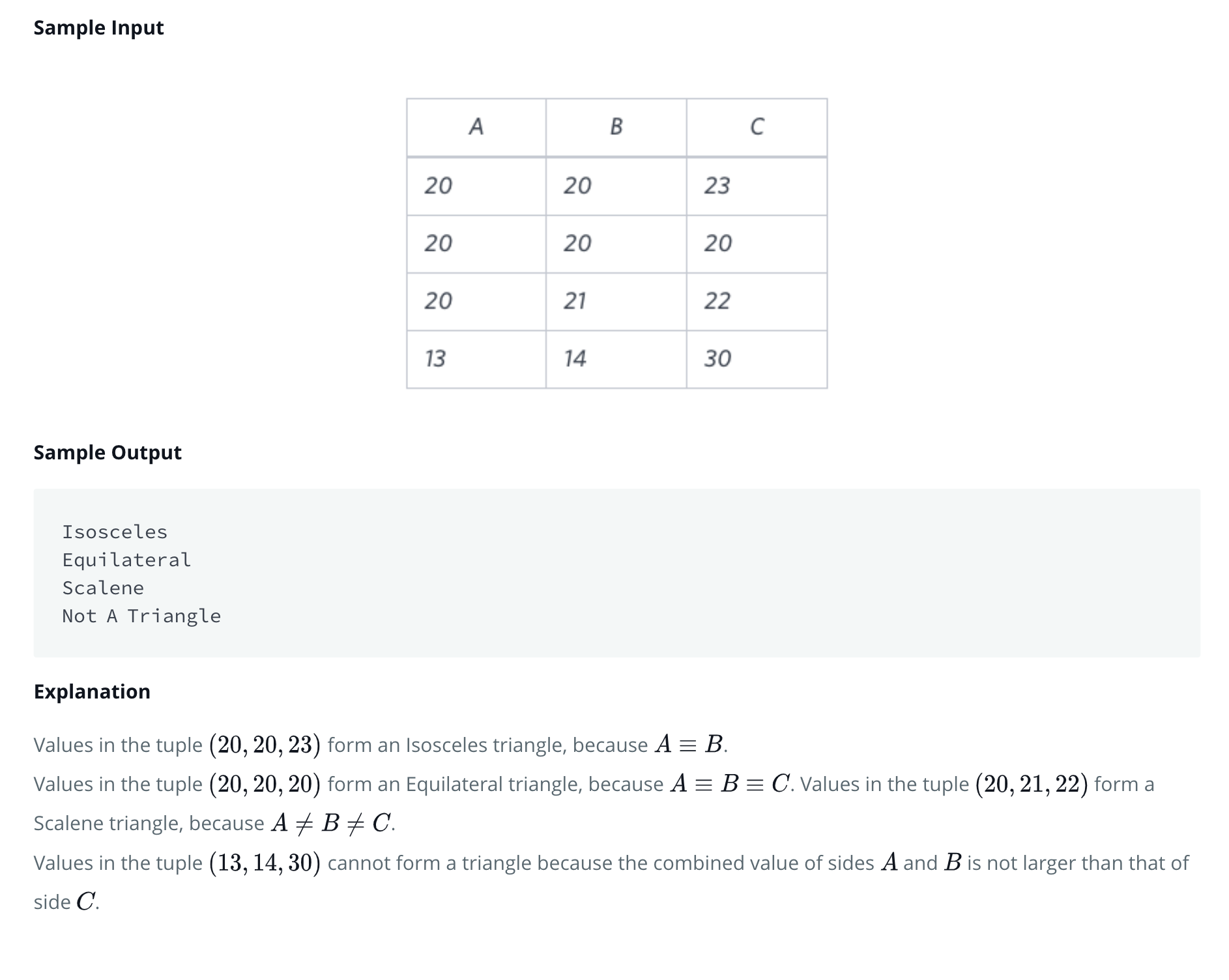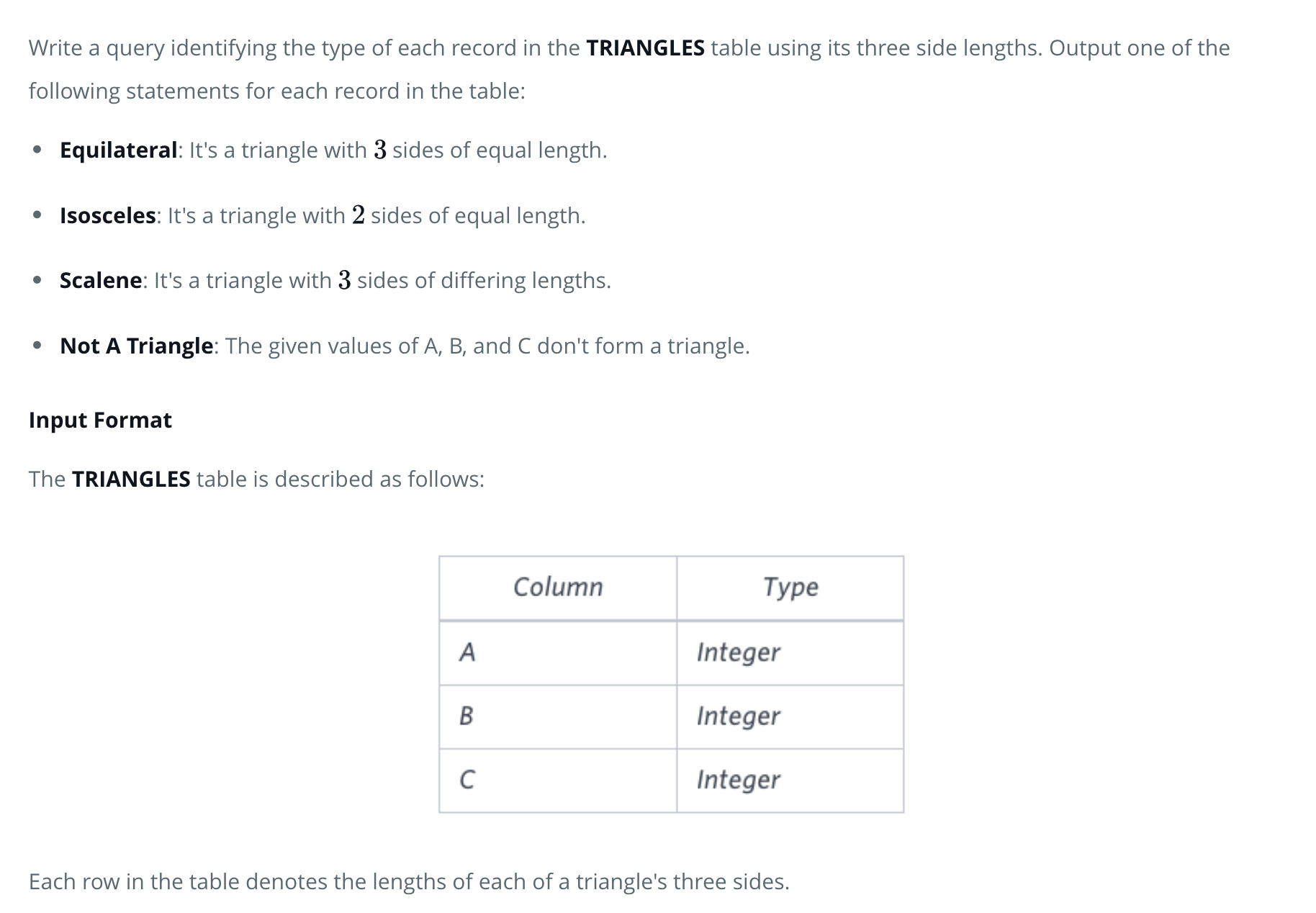 - 주어진 세 변의 길이를 통해 (a,b,c) 삼각형의 타입을 알아내는 쿼리를 작성하는 문제입니다.