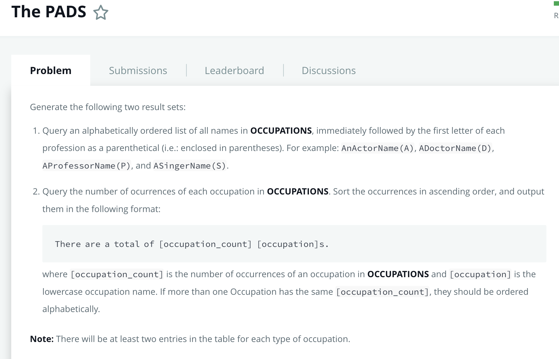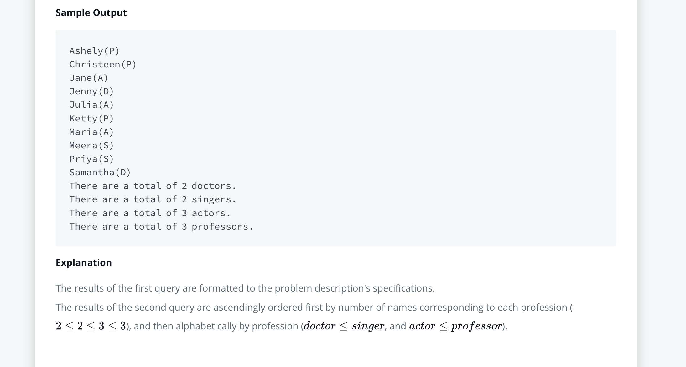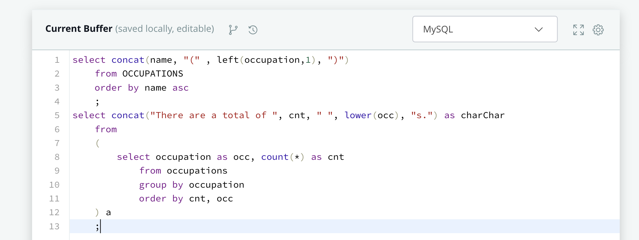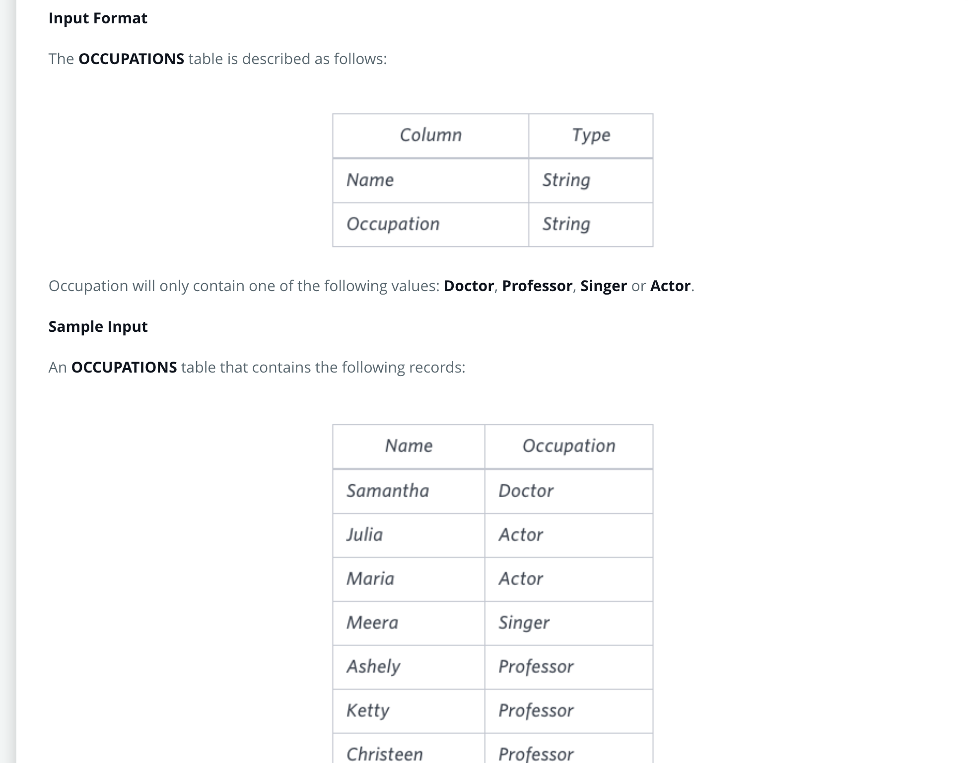 - 주어진 직업 테이블 (Occupations)에서 직업정보를 이름과 함께 문자 포멧팅하여 정렬하는 문제입니다.