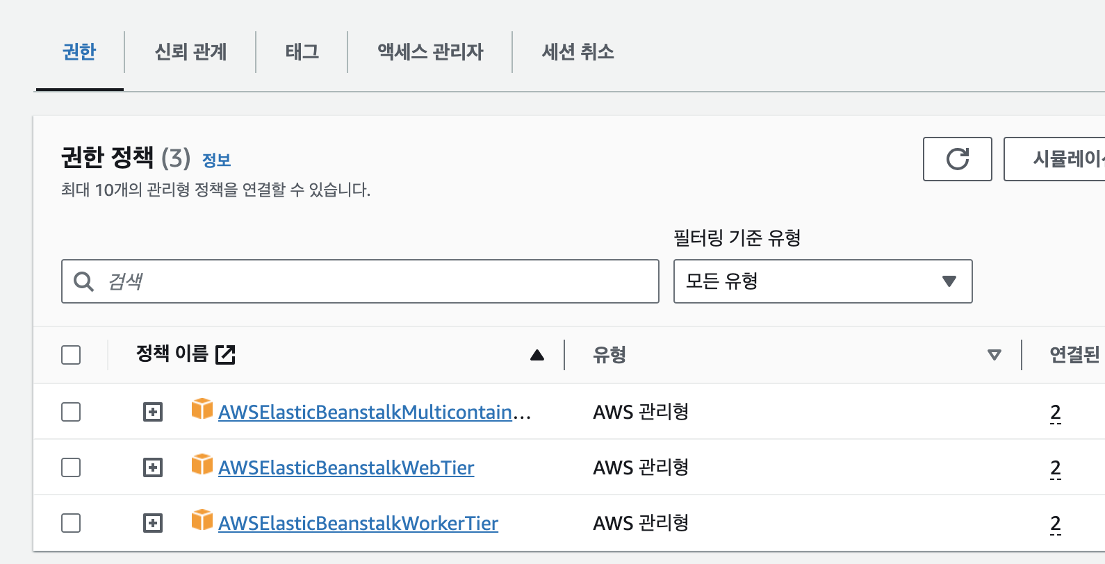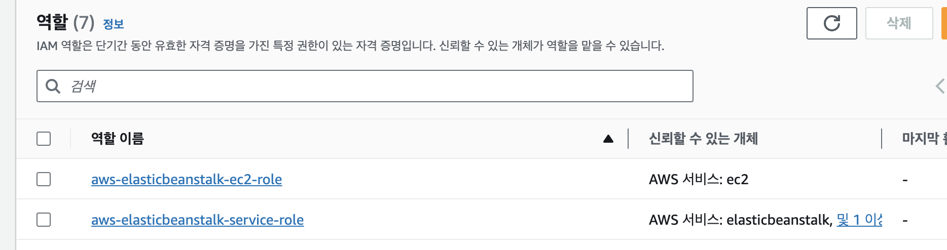 IAM 콘솔에서 위의 두 개 역할을 각각 ec2, elastic beanstalk에 대해서 생성을 하고 콘솔에서 설정시에 지정을 해주어야 한다.
