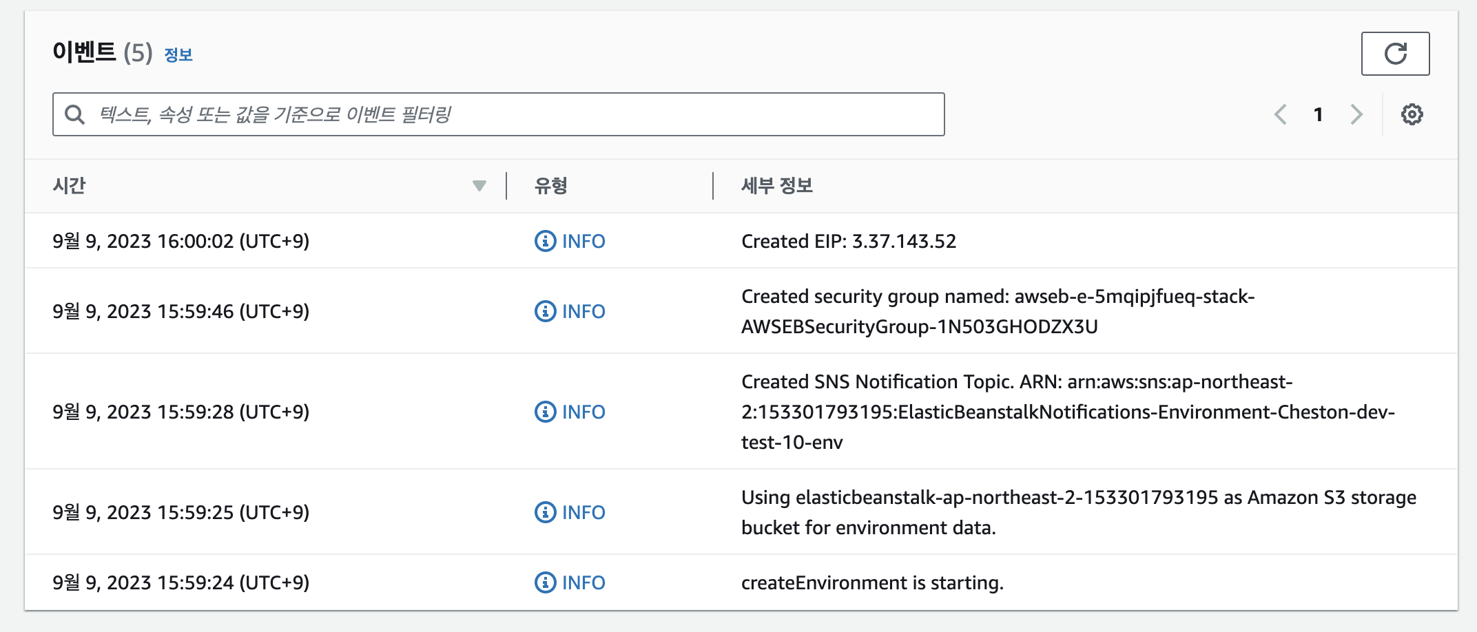 해당 ec2 인스턴스 프로파일을 생성하고 콘솔에서 설정해주면 정상적으로 환경이 생성되는 로그를 확인할 수 있다.