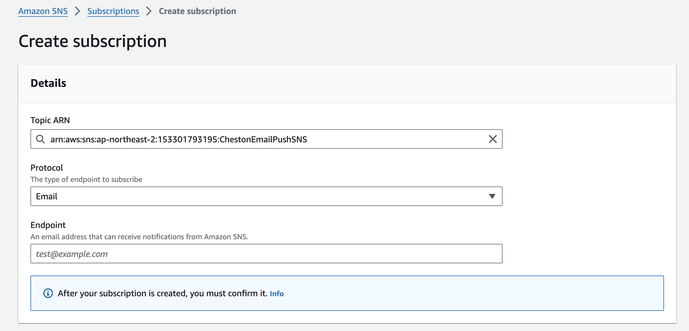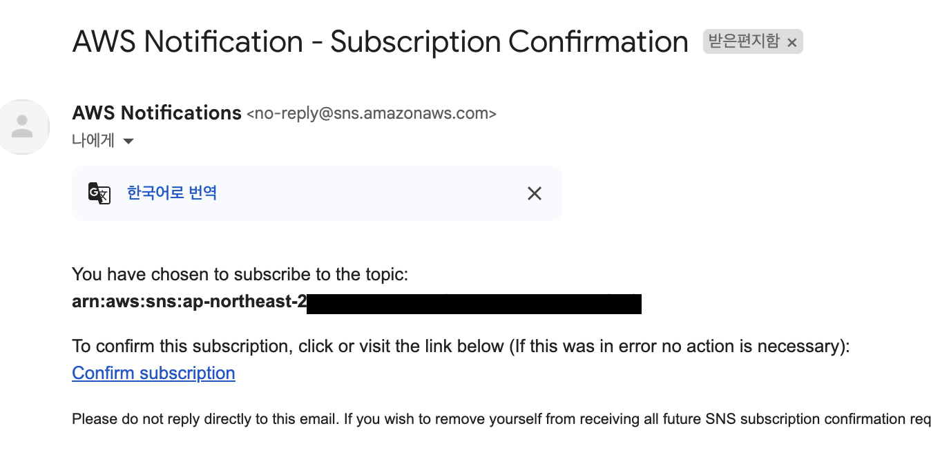 생성된 토픽을 대상으로 프로토콜을 이메일로 설정하고 엔드포인트를 알림을 받을 이메일 주소를 설정해주면 된다.