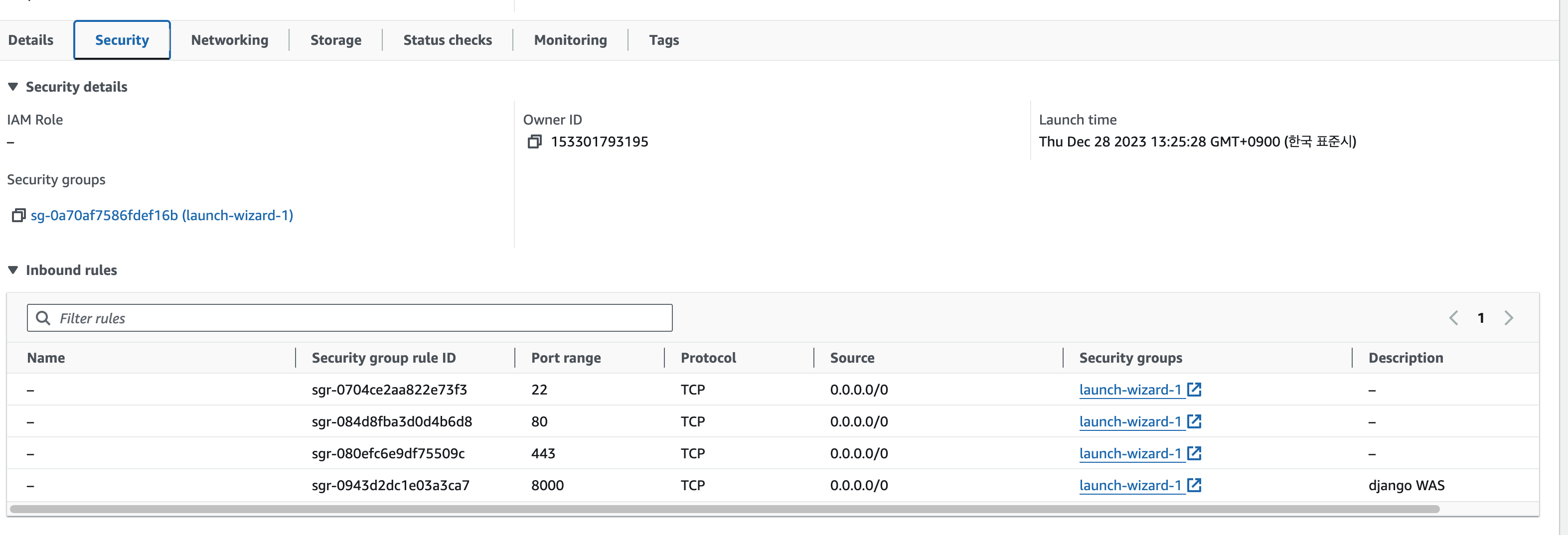 EC2의 인바운드 설정에서 8000번 포트에 대해 소스를 0.0.0.0/0 허용한다고 지정해준다. 0.0.0.0/0의 경우 모든 접근에 대해 허용한다는 의미다. 즉, 해당 django WAS가 떠있는 ec2 서버에 대해 8000번 포트로 접근하는 모든 트래픽을 허용한다는 의미로 해석할 수 있다.