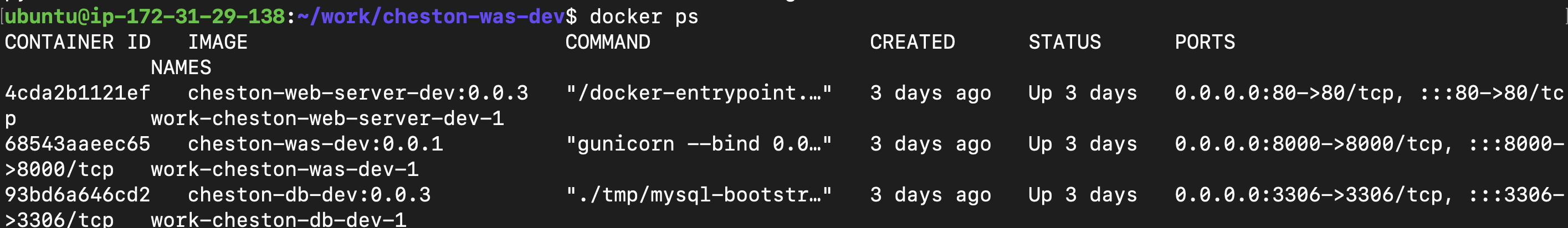 docker run -itd --name cheston-was-dev -p 8000:8000 cheston-was-dev:0.0.1-itd는 도커 run의 옵션이며 데몬(d)으로 백그라운드 수행을 하고 컨테이너와 상호작용 가능한 대화형 터미널을 열어서(i) 가상 터미널을 할당(t)하는 모드로 수행한다는 의미이다. --name 옵션으로 컨테이너명을 지정해주고 -p 옵션으로 지정한 8000:8000은 호스트 os의 8000번 포트를 해당 도커컨테이너의 8000번 포트로 연동한다는 의미이다. 맨 마지막에는 컨테이너 실행에 사용할 이미지명과 버전을 작성한다. 이후에는 docker exec -it (컨테이너명) bash로 해당 컨테이너 내부에 접속해서 명령어를 작성할 수 있다.