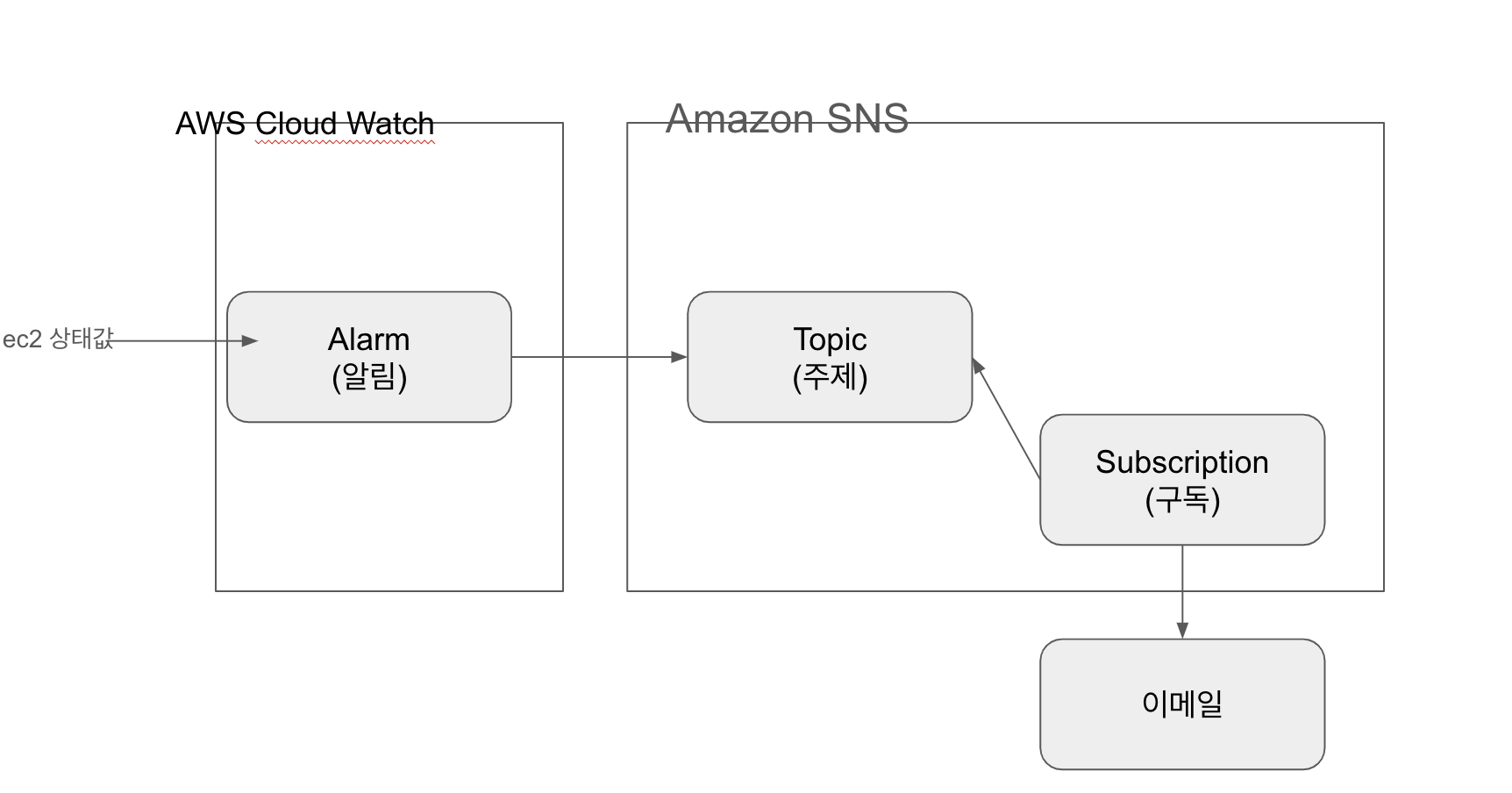 AWS SNS에 토픽으로 경고 이메일을 보내는 토픽을 생성하고, AWS 클라우드워치에 EC2 관련 노티 정책 중 StatusCheckFailed를 SUM으로 0.99 값 이상시 트리거 되도록 설정했다. 개략적으로 아래의 구조라고 보면 된다.